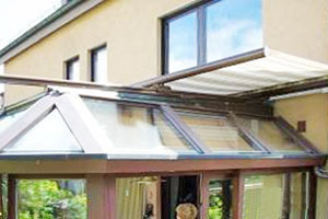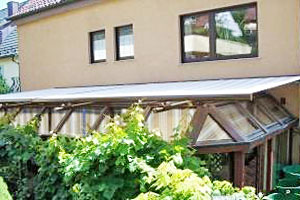 Besonderheit: Die Markise deckt auch die schrägen Glasflächen durch ihren Überstand nach vorne und seitlich ab.